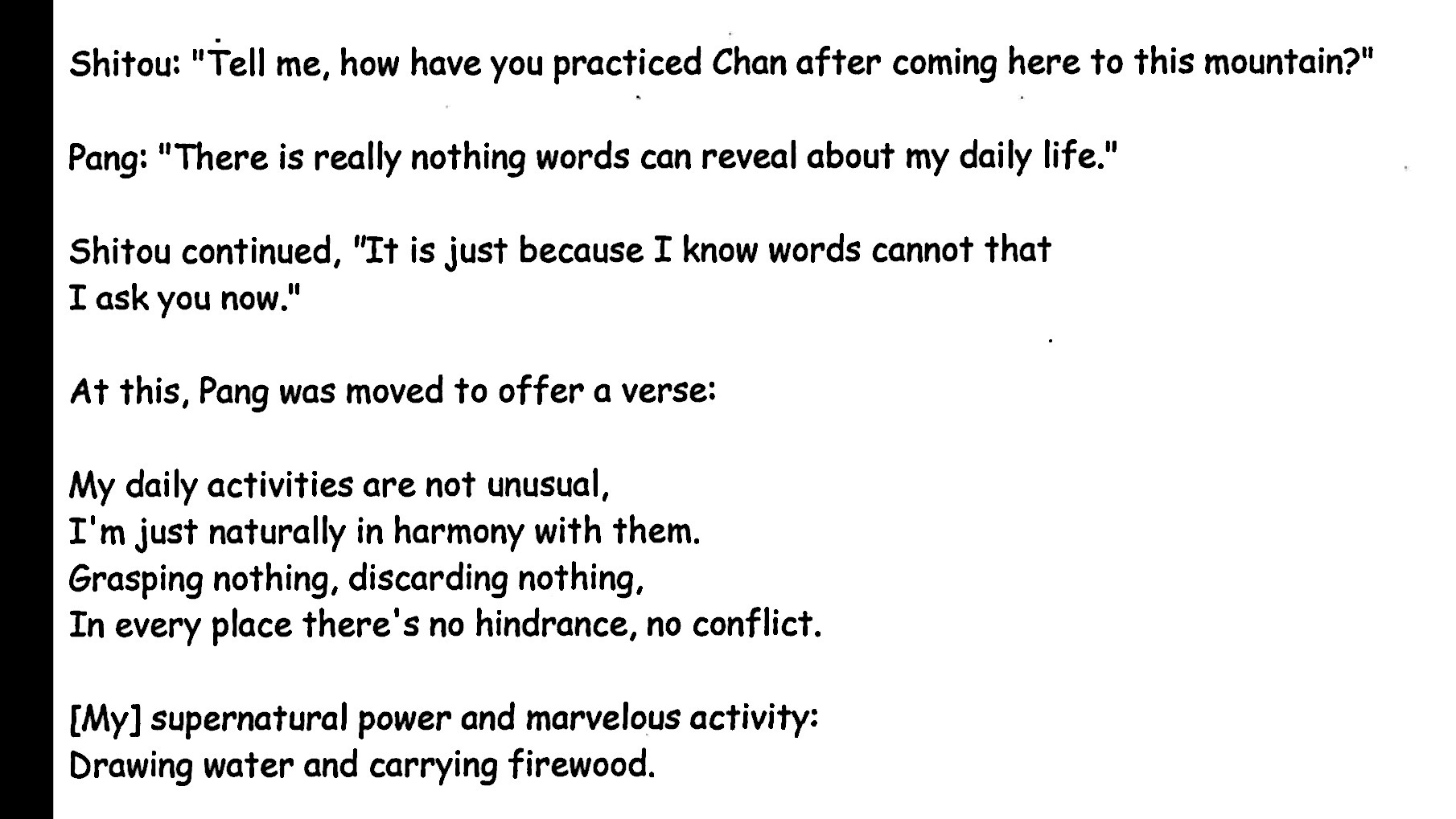 Layman Pang dropped all his wishes, hopes and expectations from the world and gained “supernatural power.” To draw water & carry firewood was then a marvelous activity.